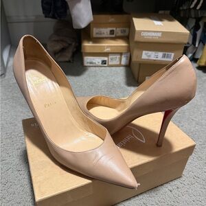 Classic pointed-toe pumps from Christian Louboutin. Smooth nude leather upper. Iconic red lacquered soles. Sleek stiletto heel for an elevated profile. Timeless and versatile style.
