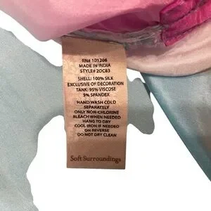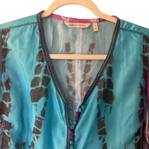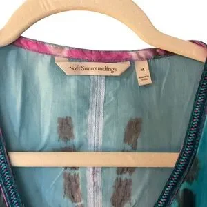 Beautifully artistic and lightweight, this Soft Surroundings sheer silk tunic top features a stunning blue, turquoise, and pink tie-dye pattern with subtle earth-tone accents. Designed with a button-front placket, relaxed silhouette, and flowy drape, it’s perfect for layering over a tank or camisole.