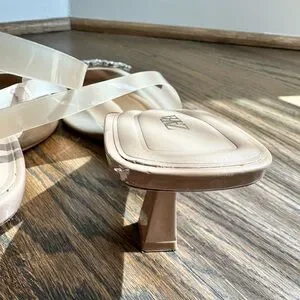 Chic nude slingback flats with pointed toes. Clear slingback strap for subtle support. Sparkling crystal buckle accent on the vamp. Cushioned footbed for comfortable wear. Versatile for dressy and casual looks.