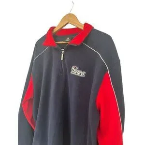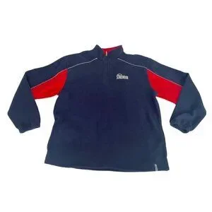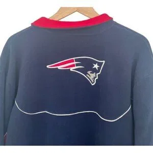NFL Apparel Reebok men's blue and red New England Patriots pullover fleece jacket. Jacket has a white embroidered Patriots patch on the front and the red white and blue Patriots logo on the back. Jacket has a 1/4 zip front and two side pockets. It's made of 100% polyester and is a man's size XL.