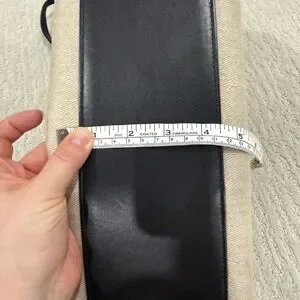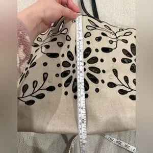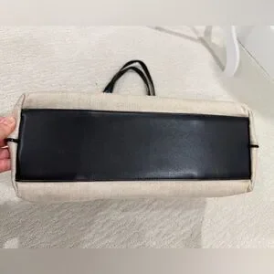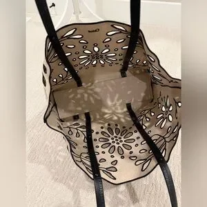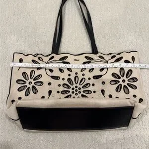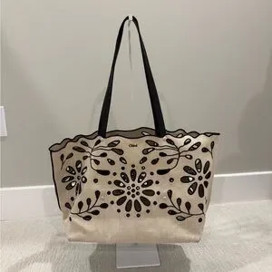 Chloé Kamilla East-West tote bag crafted in beige linen canvas with black floral broderie anglaise and black leather top handles. Overall beautiful condition. There is some light wear to the outside of the bag. Please view photos carefully. No major stains. No rips or tears to the eyelet details. Black leather straps are in nice condition with no issues to note. Original retail of this bag was $1290.