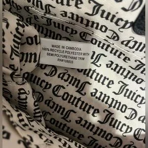 Spacious Juicy Couture travel duffel with all-over monogram print. Features sturdy black top handles and an adjustable shoulder strap. Gold-tone zipper pull and logo plaque add polish. Ideal for weekend getaways or gym trips.