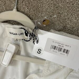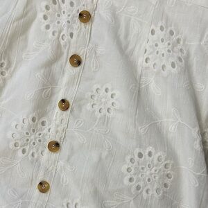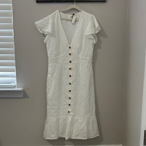 Classic white eyelet dress with a flattering V-neck and short flutter sleeves. Front button detail adds a timeless touch. Lightweight and breathable for warm-weather wear. Elegant white color suitable for casual or dressy occasions.