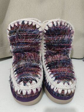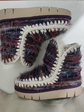 Style: Cozy ankle boot in a multicolored fuzzy tweed fabric, featuring a chunky platform sole and handcrafted whipstitch detailing