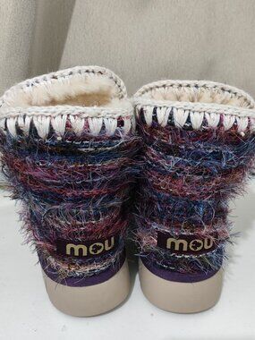 Branding: "mou" logo patch on the heel, with embossed "mou" branding on the rubber outsole confirming authenticity