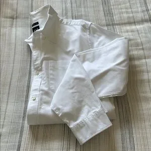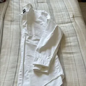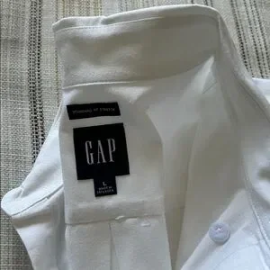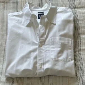 Crisp white Oxford button-down from GAP. Features a classic collar and single chest pocket. Smooth cotton fabric with clean stitching. Versatile staple for smart casual wear.