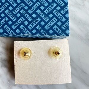 Elegant AVON gold-tone clip-on earrings with heart cutouts and dangling heart charms. Shiny gold finish for a classic, romantic look. Lightweight and easy to wear for any occasion.
