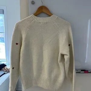 Cream crewneck sweater featuring scattered red heart motifs. Soft knit with ribbed neckline, cuffs, and hem. Charming casual piece for everyday wear.
