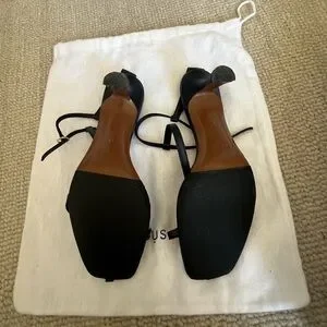 Neous navy Jumel strappy heeled sandals with a modern square toe. Slim ankle strap and minimalist silhouette for elegant day-to-night wear