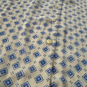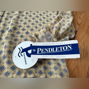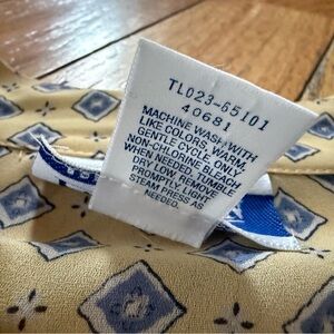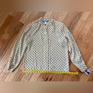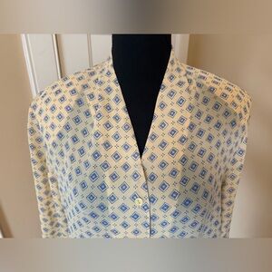 Vintage Pendleton Provence women’s yellow lightweight slightly sheer blouse with all over blue geometric print, size 10. New with tags, no flaws. Please see photos for item details/dimensions. Some photos may appear different in color due to lighting. Ships from smoke-free home.