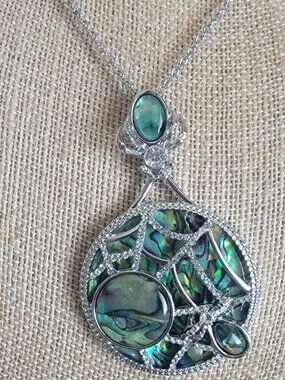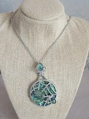 Very cool abalone spider web necklace on stainless steel chain necklace. Has a lobster closure. The necklace is 22 to 24 inches in length.