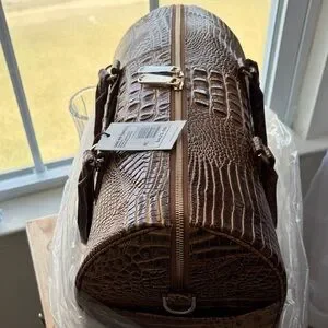 Stylish brown croc-embossed leather weekender bag with dual top handles and a secure zip closure. Smooth interior and sturdy construction for effortless travel. Classic brown tone that pairs well with any wardrobe.