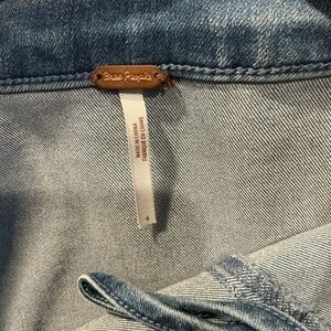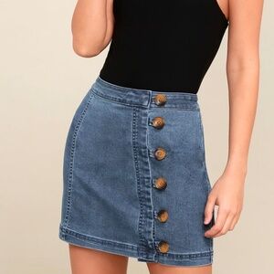 Flattering Free People denim mini skirt featuring a classic button-front design and easy medium-wash finish—perfect for everyday wear from season to season.