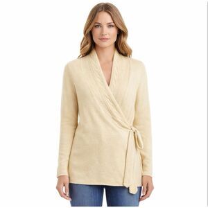 NWT Classic wrap cardigan with a side tie closure. Shawl collar with subtle cable trim. Long sleeves and a relaxed silhouette. Lightweight knit in a light warm cream tone.