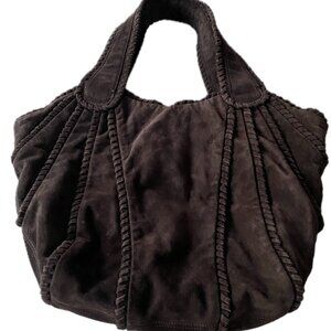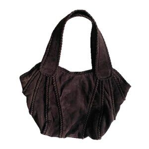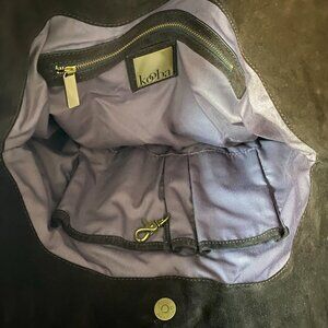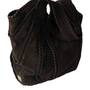 Kooba shoulder bag in soft suede. Dark brown color with stitched panel detailing. Top handles for shoulder carry. Casual yet polished style. Versatile everyday design.