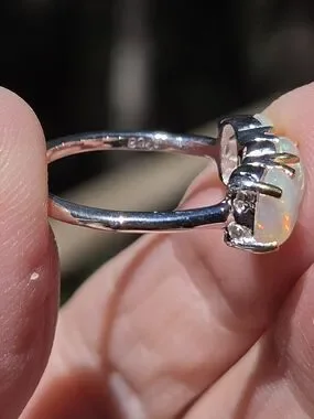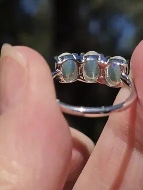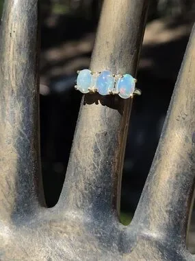 This is a lustrous trio opal solitaire set in solid 925 sterlings silver with 24k gold findings and white gold accents. The subtle play-of-color enhances the stone for an eye-catching, refined look. Classic prong setting secures the opal for comfortable daily wear. This is a new piece fresh my my jewelers studio for my Celestial Kharma Collection 2026. This triple-stone opal ring bears a striking resemblance to several celestial phenomena, both in its physical appearance and its traditional symbolism.