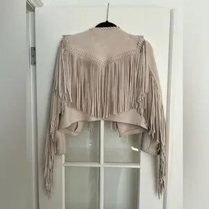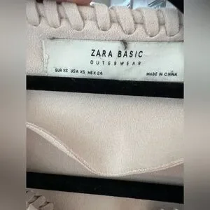 Zara Woman beige suede fringe jacket with braided trim. Soft suede feel and cascading fringe on front and sleeves. Cropped silhouette with an open front for easy layering. Chic neutral color that pairs well with casual and dress looks.
