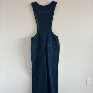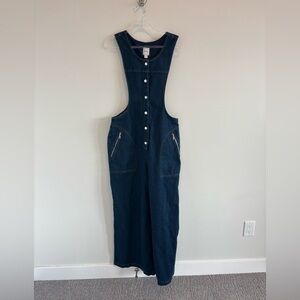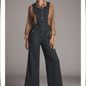 Maeve denim overalls in a deep black wash. Wide-leg silhouette for a relaxed, modern feel. Fitted bib with button-front closure. Front zip pockets and visible contrast stitching. Easy to style for day or night.