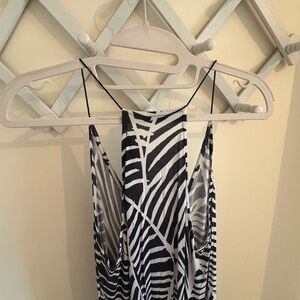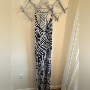 Sleeveless maxi dress with bold black and white palm print. V-neckline with thin shoulder straps. Lightweight, flowy fabric ideal for warm weather.