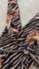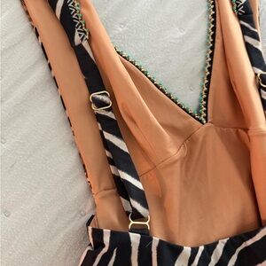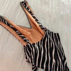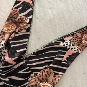 Stylish black and tan one-piece swimsuit with zebra stripes and floral accents. Flattering wrap-front design with a waist tie for an adjustable fit. Soft, lined interior for comfortable wear. Bold pattern and feminine details ideal for pool or beach days.