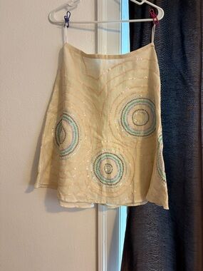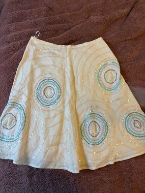 Lightweight A-line skirt with circular sequin patterns. Cream base with concentric sequin accents in green, blue, and purple. Feminine, breezy silhouette for casual or dressy looks. Easy to pair with solid tops.
