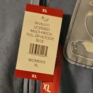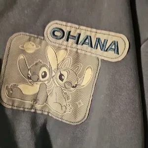 Soft blue zip-up hoodie with Stitch patches. Full front zipper and kangaroo pockets. Playful character graphics and 'Ohana' details. Casual, fan-friendly style.
