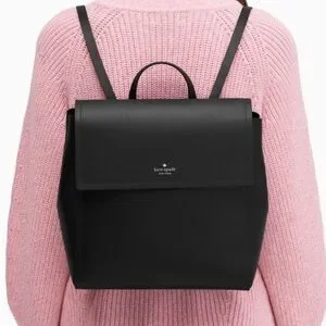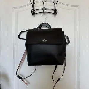 Minimal kate spade backpack in smooth black leather. Flap-top closure with subtle logo detail. Structured silhouette with comfortable straps. Clean, versatile design for everyday use. Just a slight fold at the bottom from storage.