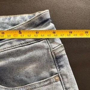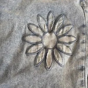 Light wash cropped / capri jeans featuring stitched daisy appliqués on the front thighs. Relaxed, flattering fit with rolled cuffs for an easy, casual look. Versatile light blue color pairs well with tees and sandals for everyday styling.