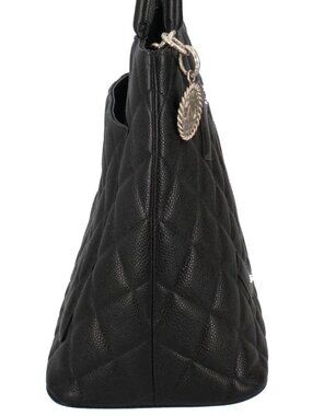 This is an authentic Chanel Medallion Tote in black caviar leather. The quilted leather design features the iconic interlocking CC logo and a detachable medallion charm.