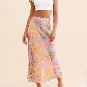 Stylish floral pastel maxi skirt in pink multi. Lightweight, flowy fabric creates a flattering silhouette. Elastic waist for comfortable all-day wear. Versatile skirt that pairs well with crop tops and sandals.