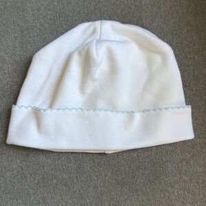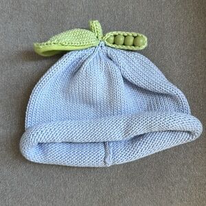 Soft light blue knit hat with green peas detail plus two Pima cotton hats with scallop embroidery. Comfortable, breathable fabrics for everyday wear. Gentle colors—light blue and white—pair easily with outfits. Ideal for keeping young heads cozy and stylish.
