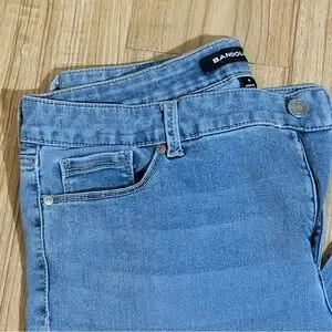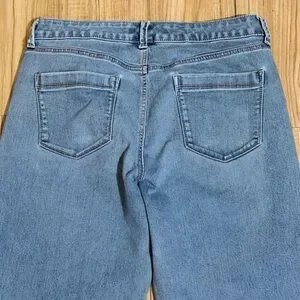 Bandolino men's straight leg jeans in a light blue wash. Clean design with classic five-pocket styling. Sturdy denim with subtle fading for a lived-in look. Versatile for casual and everyday wear.