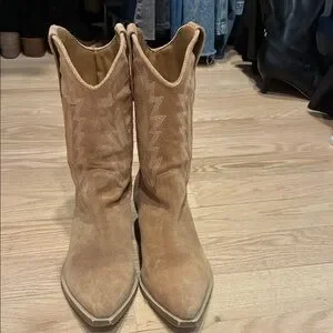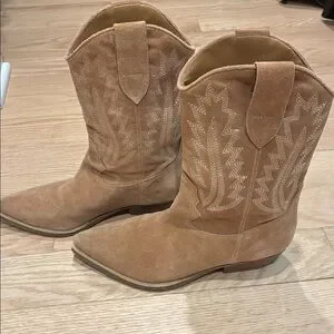 Marc Fisher suede ankle boots with western styling. Pointed toe and stitched zigzag accents. Pull-on tabs for easy wear. Neutral tan shade for versatile outfits. The soles have some wear and tear, but the suede is in very good condition. Just one flaw that’s shown in the photos.