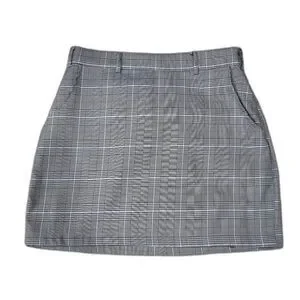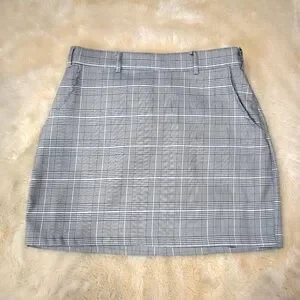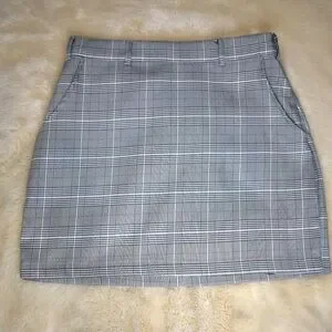 It features a classic high-rise fit, convenient side and back pockets, and a side zipper closure for a smooth silhouette. The plaid print gives it a timeless yet modern feel—ideal for pairing with chunky boots, tights, or sneakers.