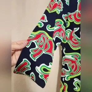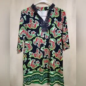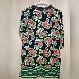 Vibrant Crown & Ivy tunic elephant print mini dress. Features red, green, and black colors. Perfect for a bold look, vacationor the beach. this stretchy dress features a v-neck and crochet detail.
