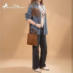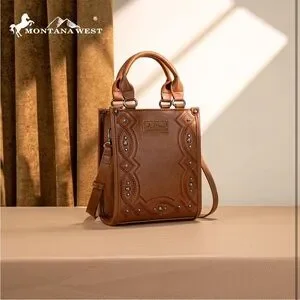 Montana West Western embroidery collection small vegan leather crossbody bag. Exquisite embroidery and silver rivets adorn the front of the crossbody purse. Top button closure, Interior has a zippered pocket and an open pocket with a zipper pocket on the back. 7.5"(L) x 3.5"(W) x 9.3"(H) Handles 5”.