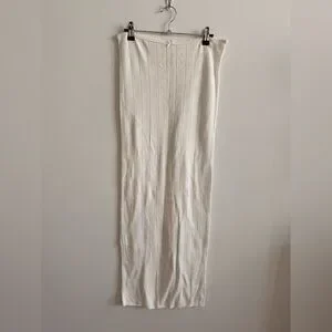 Cream pointelle knit maxi with vertical rib detailing. Soft stretch fabric for a close fit. Straight, streamlined silhouette. Versatile piece for casual or layered looks.