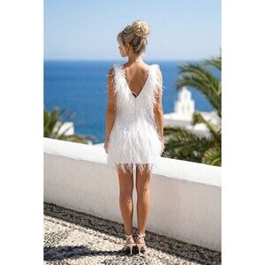 LAMARQUE Alena mini dress in crisp white brings instant main-character energy. The V-neck and sleeveless cut keep it sleek up top, while the allover ostrich feather trim adds playful movement with every step. A smooth stretch lining makes it easy to wear from cocktails to dancing. Perfect for bridal events, bachelorette weekends, weddings, resort vacations, travel, or a night out. Size Medium. New with tags.