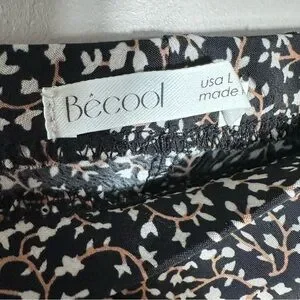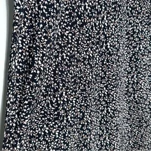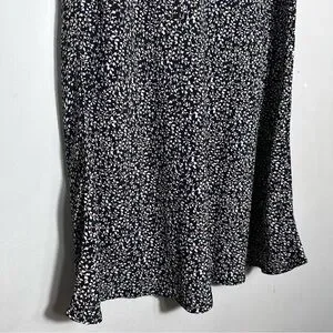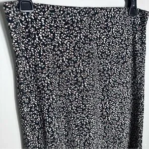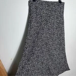 Flowy black maxi skirt with small white floral print. Soft drape and easy pull-on fit. Versatile for casual or dressed-up looks. Pairs well with tees or blouses. Elastic waist