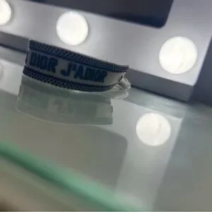 Dior J'Adior woven ribbon bracelet. White base with black logo text. Simple, chic accessory for everyday wear.