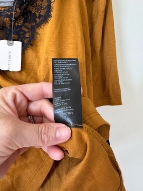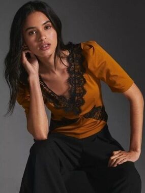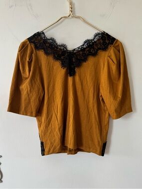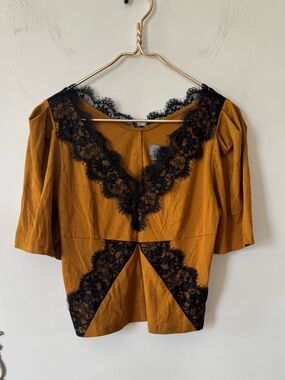 NWT by Anthropologie Mustard Gold and Black Lace Puff Sleeve Top S