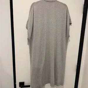 Light gray open-front cardigan with short dolman sleeves. Front patch pockets for small essentials. Soft knit fabric for comfortable layering. Draped, minimalist silhouette for versatile styling. Perfect for casual and dressy evenings to throw on top of anything. Notice small rhinestone detail on back of hem!