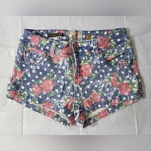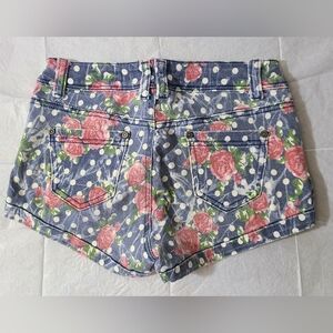 Playful floral and polka dot denim shorts. Lightweight stretch jean fabric for comfort. Low-rise cut with classic five-pocket styling. Feminine pink rose print on blue background.