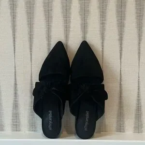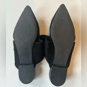 Stylish pointed-toe flats with a decorative bow. Slip-on mule silhouette. Soft suede-like finish. Versatile black color for everyday wear.