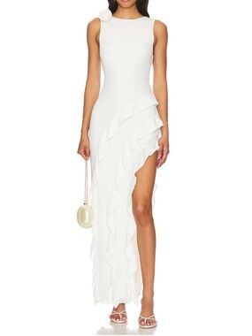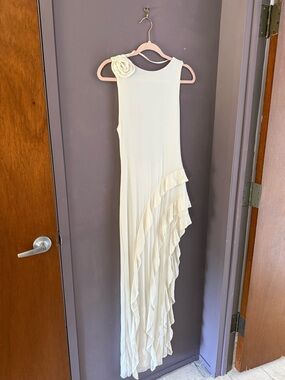 Sleek white sleeveless gown with cascading ruffle tiers. High-low asymmetric skirt with a dramatic side slit. One-shoulder rosette detail at the neckline. Streamlined silhouette for polished evening wear.