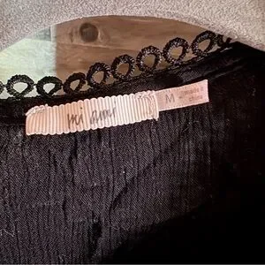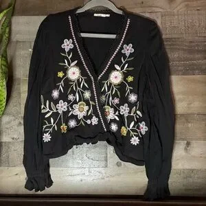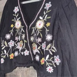 Black blouse with colorful floral embroidery at the front. V-neckline with decorative trim. Long blouson sleeves with gathered cuffs. Lightweight, flowing fabric for easy styling.