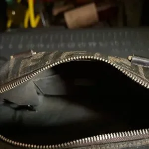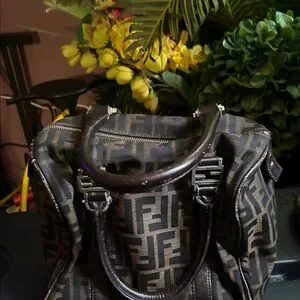 Fendi handbag with all-over Zucca FF monogram. Dark brown canvas body with darker trim and handles. Top zip closure and dual rolled leather handles. Metal hardware accents. Elegant designer silhouette.key chain need to be fix upper zipper is off