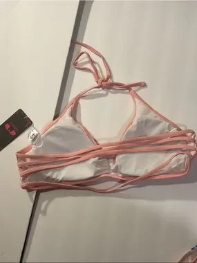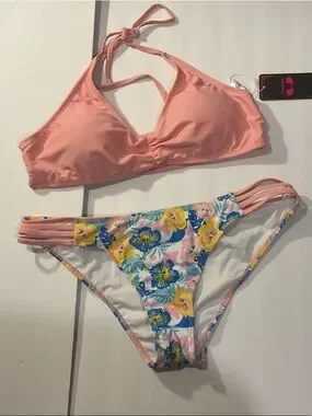 NWT Women’s Pink Halter Bikini Top with Floral Strappy Bottoms
