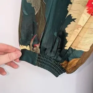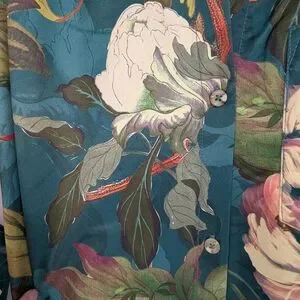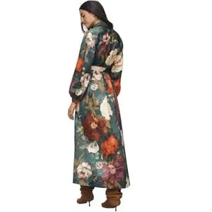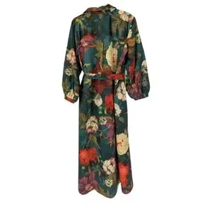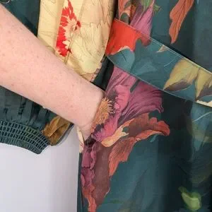 New with tags! Maeve by Anthropologie "The Mona Silky Maxi Shirt Dress" — a show-stopping piece in a rich teal base with a lush, painterly floral print in red, cream, pink, purple, and gold. The silky drape, voluminous balloon sleeves, and floor-grazing maxi length make this a true statement dress perfect for spring events, garden parties, weddings, or a dressed-up night out. The self-tie waist belt lets you define your silhouette and the hidden side pockets add practical charm.