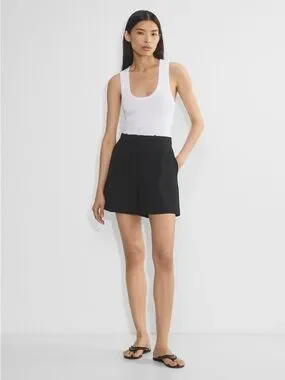 • These are high-rise pleated shorts with a relaxed fit and darted back waist. They’re made with (Re)ssential — softly structured stretch fabric that holds its form while you move easy. This fabric is sourced from a premier Portuguese mill and made with 54% recycled polyester and 26% LENZING™ ECOVERO™ Viscose.